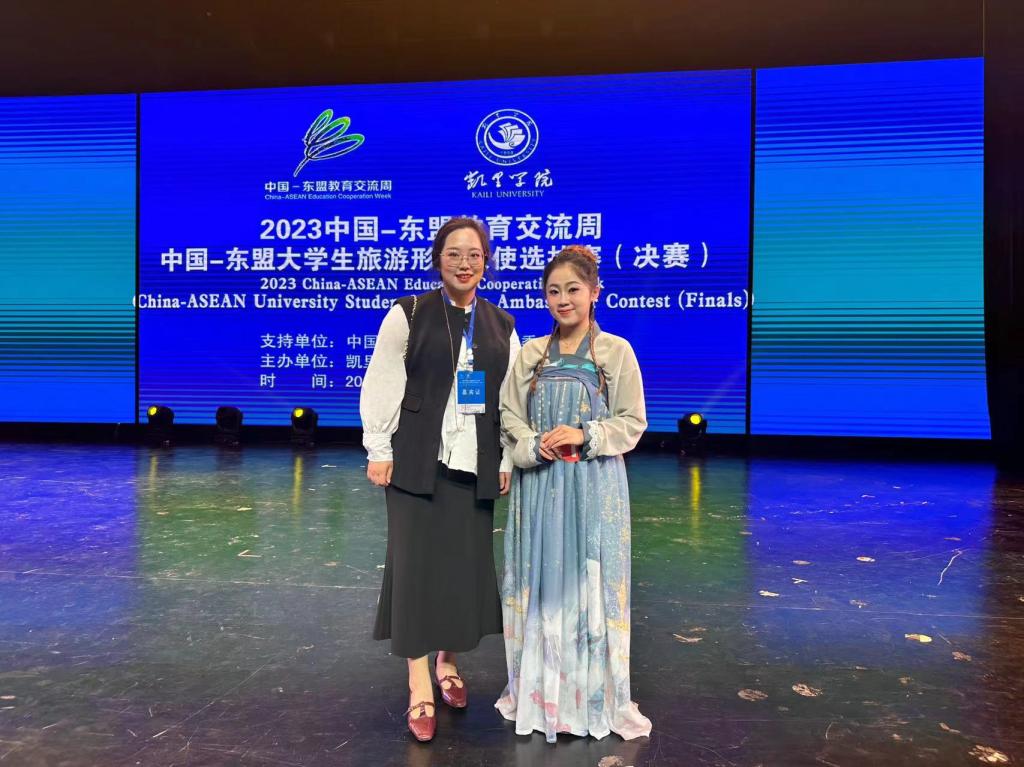 Source of manuscript: International Cooperation and Exchange Department Release time: November 1, 2023 From October 25th to 27th, the final of the 2023 China ASEAN Exchange Week "China ASEAN University Student Tourism Image Ambassador Selection Competition" came to an end at Kaili College in Guizhou Province. Shi Lianhua (Indonesian), a 2019 undergraduate student majoring in clinical medicine at our university, won the Excellence Award, while LiYanxin, a young teacher at the School of International Education, won the “Award for Outstanding Instructor”.The China ASEAN Education Exchange Week is jointly hosted by the Chinese Ministry of Foreign Affairs, the Ministry of Education, and the People's Government of Guizhou Province. It is an important international exchange platform with education as the theme, promoting cultural and educational exchanges and development between China and ASEAN regions. This year's "China ASEAN University Student Tourism Image Ambassador Selection Competition" is one of the annual naming activities of the "China ASEAN Education Exchange Week", aimed at promoting Chinese tourism culture, showcasing the image of China ASEAN university students, deepening interaction, enhancing friendship, and strengthening the cultivation of tourism talents for both sides.This competition attracted international students from 15 universities across the country to participate. The 20 contestants who advanced to the final are from 10 universities including Jiangsu University, Guangxi University, Guizhou University, as well as 9 countries including Laos, Indonesia, Zimbabwe, Tanzania, Uganda, and France.After intense competitions such as showcasing her charm, recommending tourist attractions, answering questions about tourism knowledge, and showcasing her talents, 施莲花won the first place of the Excellence Award with her steady typhoon, excellent Chinese singing, and familiar introduction to the scenic spots.Shi Lianhuasaid, "Through this competition, I have gained more knowledge of China's beautiful landscape. I hope I can visit all the beautiful places in China. ASEAN is China's good neighbor, good partner, and good friend to jointly build the" the Belt and Road ". We are the responders and beneficiaries of this "happy road ". I will continue to work hard to be an ambassador for cultural exchanges."