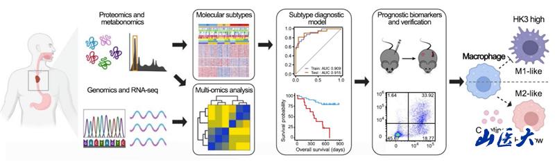 The researchers conducted metabolomic and proteomic analyses of ESCC, which allowed for a detailed characterization of the protein-metabolic landscape in ESCC.By integrating these findings with previous genomic and transcriptomic data, the molecular features of ESCC were further enriched. Furthermore,based on proteomics and metabolomics, three subtypes (S1, S2, and S3) with significantly different metabolic-immune characteristics were identified, and a subtype prediction model was developed. The S3 subtype exhibited the worst prognosis, with a significantly suppressed immune microenvironment, manifested as an increase in the infiltration of M2-type tumor - associated macrophages (TAMs) and a decrease in the infiltration of CD8+T cells, CD4+ T cells, and NK cells. Creatine accumulation and reduced hexokinase 3 (HK3) protein expression were two characteristics of the S3 subtype. Subsequently, through animal and cell experiments, the researchers found that creatine accumulation and decreased HK3 might mediate an energy transformation. These two factors, by reprogramming the energy metabolism of TAMs, synergistically drive the polarization of TAMs into the M2 type, thereby remodeling the immunosuppressive microenvironment of ESCC.
