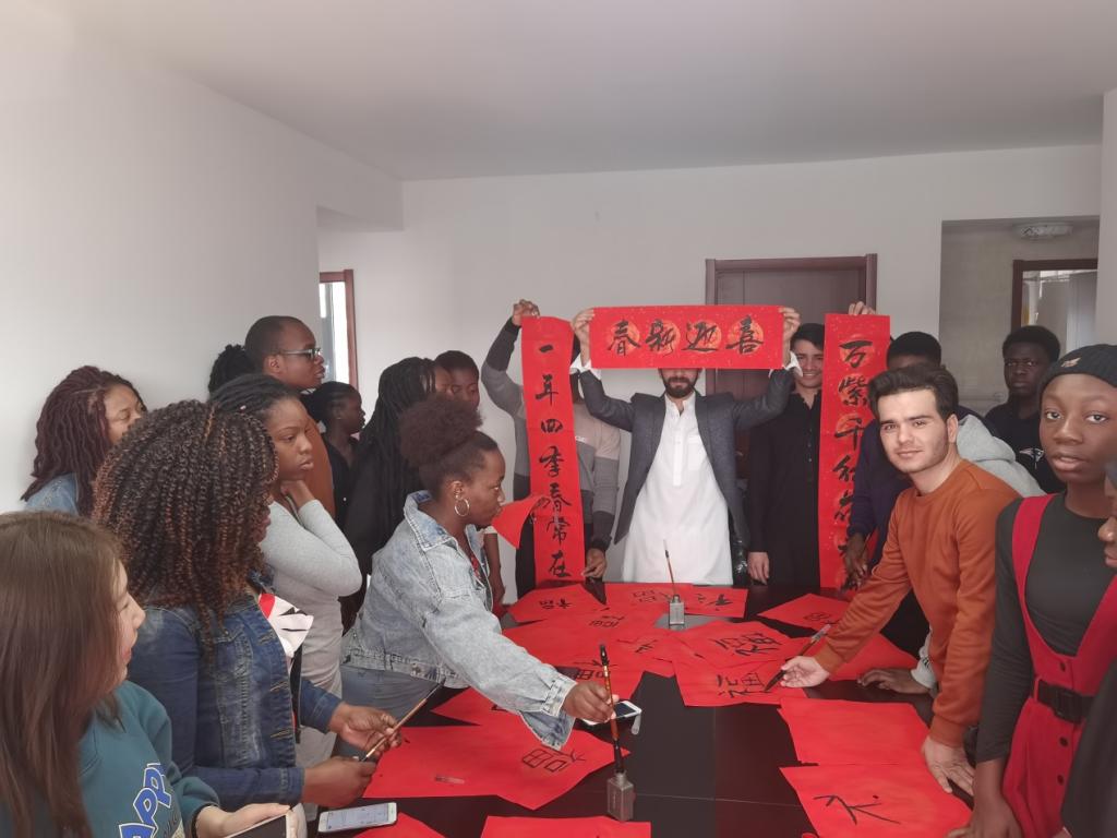 Rong Na, the teacher from the International Education College, first introduced the Chinese Spring Festival customs and traditions to the international students. Then they wrote the couplets together, where "colorful", "auspicious" and " soaring" wishes with immature but unique handwriting appeared on papers. The students excitedly pasted the couplets written by themselves at the door of the apartment. The atmosphere of the event was warm and full of joy.