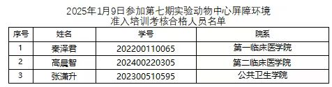 各位老师,同学: 参加2025年1月9日第七期屏障环境动物实验室准入培训考核合格人员名单详见附件。合格有效期为一个月。超过一个月进屏障环境开展动物实验需要重新参加考试,请大家知悉。