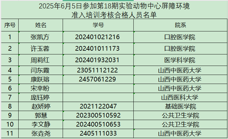 以上考核人员须在一个月内进入屏障开展实验,逾期未进者需重新接受培训考核,望知悉!