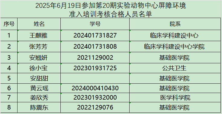 以下培训合格人员须在一个月内进入屏障开展动物实验,逾期须重新接受培训和考核,望知悉!