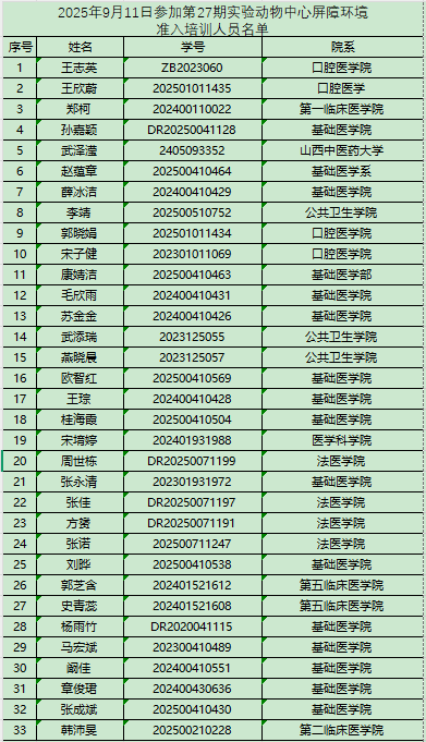 请以下参培人员于2025年9月11日下午14:30到中都校区实验动物中心三层多功能会议室参加培训和考试!