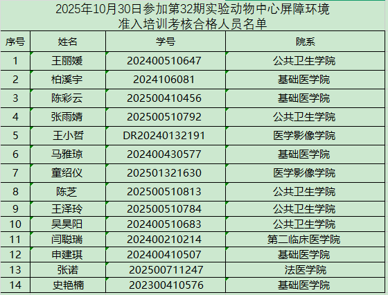 以下培训合格人员需在一个月内进入屏障开展动物实验,逾期未进者须重新接受培训和考核!