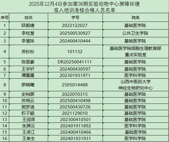 以下培训合格人员需在一个月内进入屏障开展实验,逾期未进者须重新接受培训和考核,望周知!