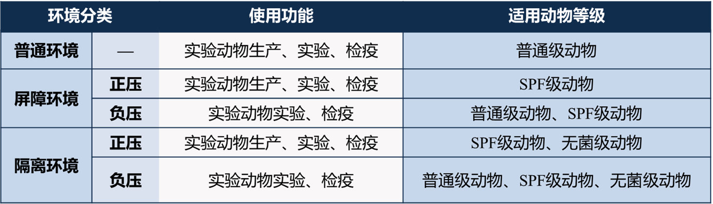 实验动物环境及适用动物等级应按下表进行分类:
