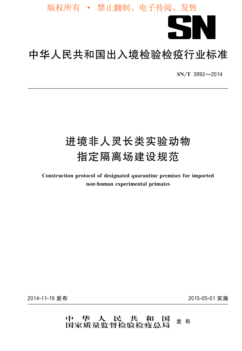 SN-T 3992-2014 进境非人灵长类实验动物指定隔离场建设规范