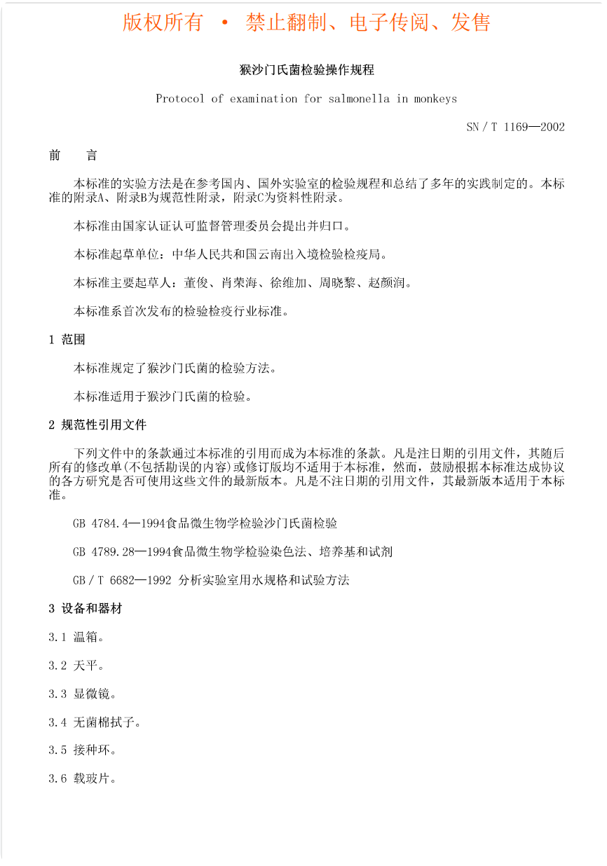 SN-T 1169-2002 猴沙门氏菌检验操作规程