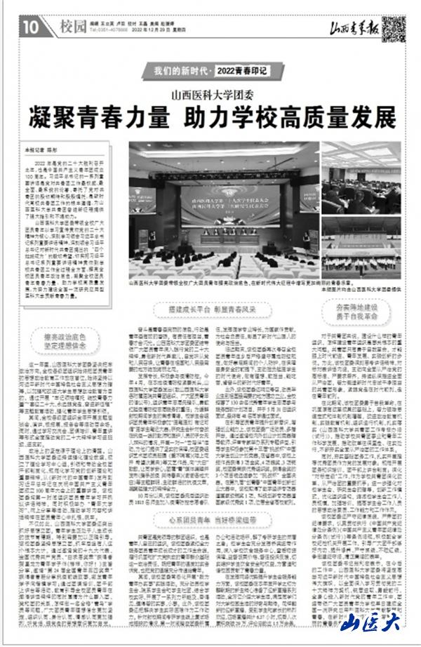 12月29日,《山西青年报》在第10版(校园)整版刊发了题为《万象城allwincity官网团委:凝聚青春力量 助力学校高质量发展》的新闻通讯,专题报道万象城共青团组织紧扣“党的助手和后备军”定位和“围绕中心、服务大局”主线,牢牢把握保持和增强政治性、先进性、群众性的目标方向,聚焦“政治学校、先锋力量、桥梁纽带、先进组织”持续发力,坚持做党联系青年最为牢固的桥梁纽带,引领全校青年学子坚定不移听党话、跟党走,全方位聚力青春建功高质量发展,让青春在学校早日建成全国一流研究应用型医科大学的火热实践中绽放绚丽之花。