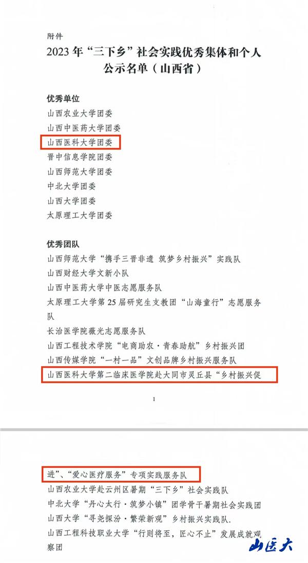 近日,为做好典型宣传、激励广泛参与、发挥育人实效,团中央组织开展了2023年全国暑期“三下乡”社会实践活动总结工作,经充分研究、严格把关,结合活动开展的实效和日常工作了解情况,对表现突出的集体和个人进行了通报表扬,万象城团委入选2023年全国暑期“三下乡”社会实践优秀单位,第二临床医学院赴大同市灵丘县专项实践服务队入选优秀团队。