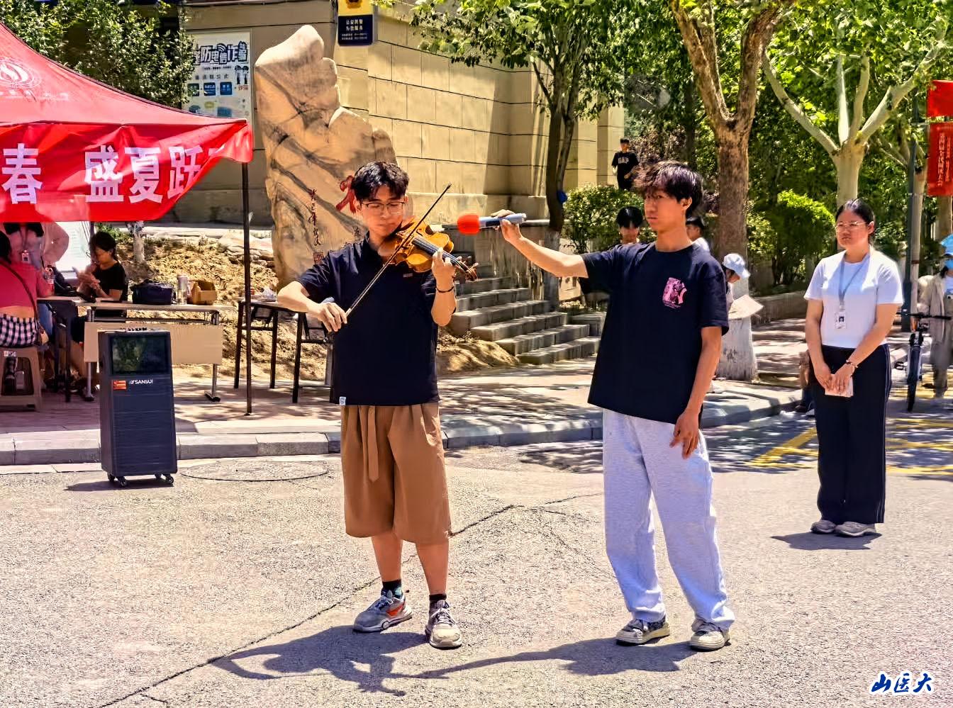 路演展示区域更是亮点频出。书法绘画协会的同学们现场挥毫泼墨,宣纸铺展间“表里山河”苍劲有力的大字跃然纸上,引得围观同学纷纷赞叹;Rhythm音乐社团带来的小提琴独奏旋律悠扬婉转,如潺潺溪流般浸润着每一位听众的心灵。民谣演唱的同学以轻柔的曲调、质朴的歌词引得大家轻声和拍哼唱;LD舞蹈社团的同学们以利落的舞步、动感的节奏将全场气氛推向高潮。