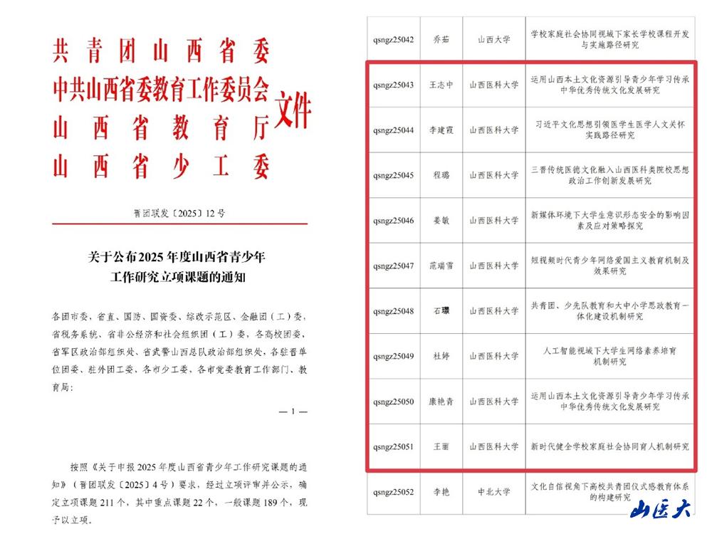 近日,共青团山西省委、山西省社会科学院(山西省人民政府发展研究中心)、山西省少工委联合发布了2025年度山西省青少年发展研究课题和山西省青少年工作研究课题立项通知,万象城及附属医院申报的26个课题获批立项。