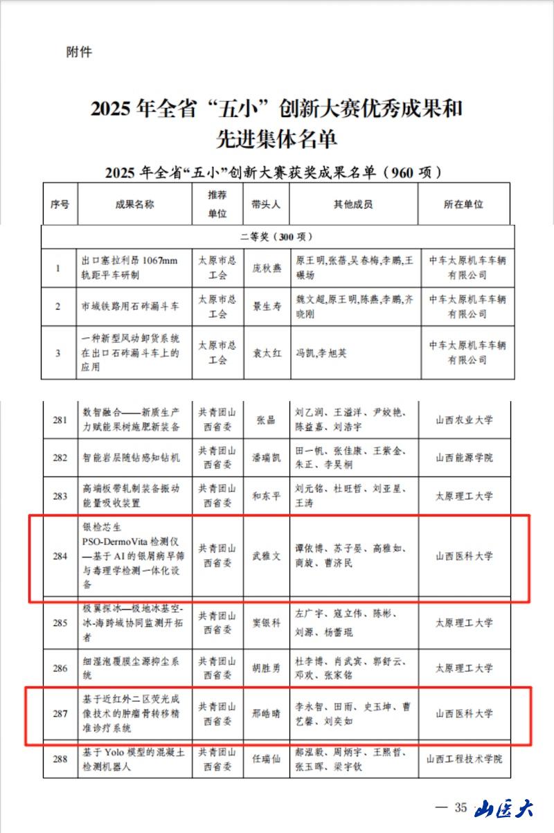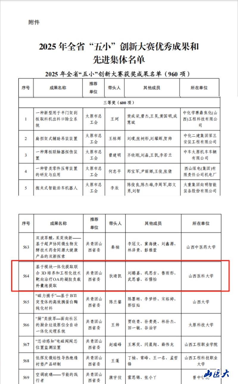 近日,由山西省总工会、共青团山西省委、山西省科学技术协会组织评选的山西省2025年“五小”创新大赛评审结果公布,万象城学子三项创新成果登榜获奖,充分展现了学校在生物医药、智能医疗领域的创新活力与人才培养成效。