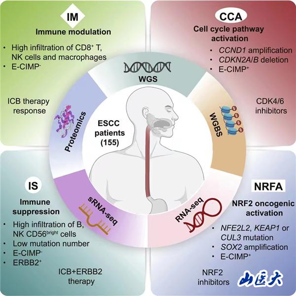 该研究纳入155例食管鳞癌患者配对样本进行了全基因组、表观基因组、转录组和蛋白质组数据层面的全面整合分析;利用多组学分析首次将食管鳞癌分为细胞周期通路激活型(CCA)、NRF2通路激活型(NRFA)、免疫抑制型(IS)和免疫调节型(IM)(图1)。CCA亚型体现在细胞周期检查点基因的变异,而NRFA亚型则有NRF2通路基因的激活。CCA和NRFA亚型患者均具有CpG岛甲基化表型(E-CIMP+),并与淋巴节转移和临床分期相关。IS和IM亚型是免疫细胞高浸润型,但肿瘤组织浸润的免疫细胞类型不同。研究者进一步利用43例接受PD-1抗体单药治疗队列研究,发现IM亚型对免疫检查点阻断疗法(ICB)有更好的治疗响应,并基于该队列ESCC组织多组学数据开发了识别IM亚型患者的分子特征分类器。本研究首次基于多组学数据对食管鳞癌进行分子分型,并为每个亚型寻找了潜在的治疗靶标和/或诊断标志物,为后续开展针对食管鳞癌各亚型的药物研发及临床实验研究,制定出针对不同亚型食管鳞癌的精准治疗提供了可能。
