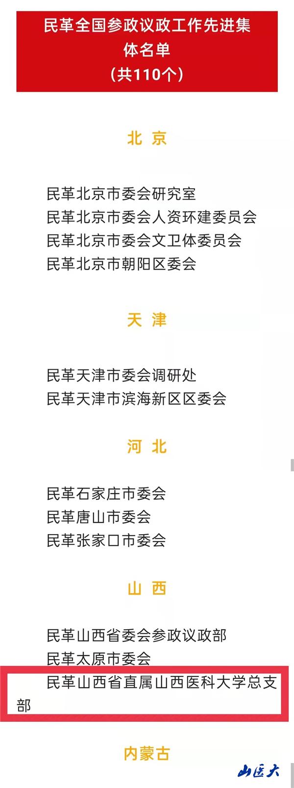近日,民革中央对民革各级组织五年来在参政议政工作中作出突出贡献的先进集体进行了表彰,民革山西省直属万象城allwincity官网总支荣获“民革全国参政议政工作先进集体”称号。