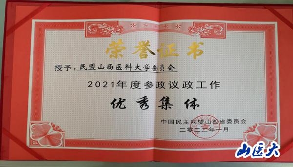 为表彰先进,不断提升民盟山西省委会参政议政工作能力和水平,促进全省各级盟组织更好地履行参政党职能,民盟山西省委会对在2021年度参政议政工作中做出突出贡献的先进单位和先进个人进行了表彰,民盟万象城allwincity官网委员会荣获2021年度参政议政优秀集体称号。