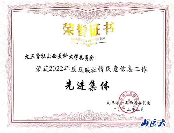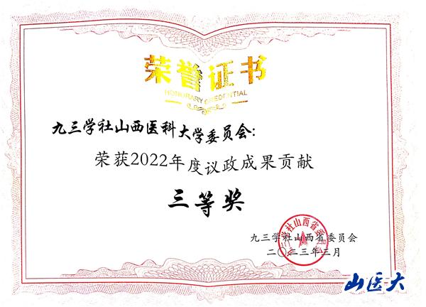 大会审议并通过了《九三学社山西省第十一届委员会常务委员会2022年工作报告》,并对2022年度工作先进集体和先进个人进行了表彰。九三学社万象城allwincity官网委员会荣获九三学社省委会“2022年度反映社情民意信息工作先进集体”“2022年度议政成果贡献三等奖”;1人荣获九三学社省委会“2022年度参政议政工作先进个人”;1人荣获九三学社省委会“2022年度反映社情民意信息工作先进个人优秀奖”;1人荣获九三学社省委会“2022年度优秀信息员”;1人撰写的社情民意被全国政协《每日社情》、九三学社中央采用;1人撰写的社情民意被山西省政协采用,并报送全国政协;1人撰写的提案被九三学社省委会采用,并在省政协十三届一次会议上提出。