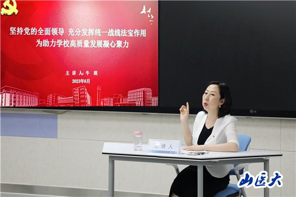 牛琪以《坚持党的全面领导、充分发挥统一战线法宝作用,为助力学校高质量发展凝心聚力》为题,从深刻理解习近平总书记关于做好新时代党的统一战线工作的重要思想;坚持党的全面领导,构建大统战工作格局;做好民族宗教工作,确保校园安全稳定;以开展主题教育为契机,凝心聚力助力学校高质量发展四个方面和大家进行了交流。