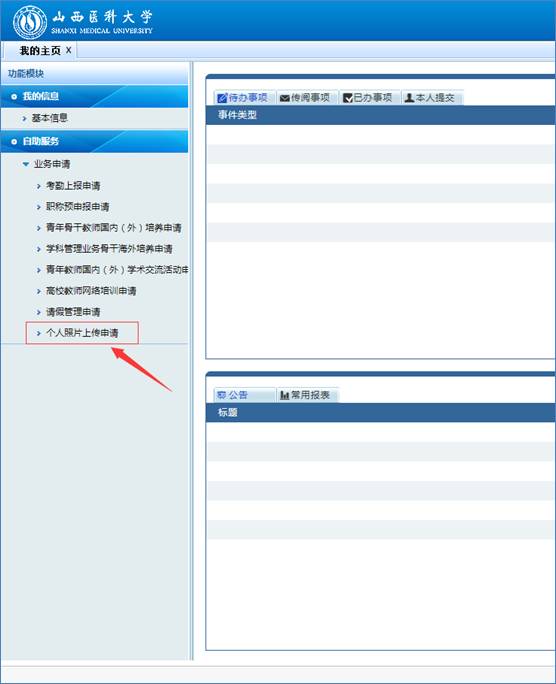 3、在左边列表中选择自助服务->业务申请->个人照片上传申请,如图4。
