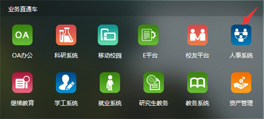 2、在业务直通车栏目下点击人事系统如图2,无需输入用户名和密码二次认证,进入人事系统 ,如图3。