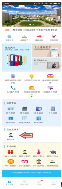 进入“掌上万象城”后在业务直通车栏目下点击移动OA,无需输入用户名和密码二次认证,直接进入OA移动端。
