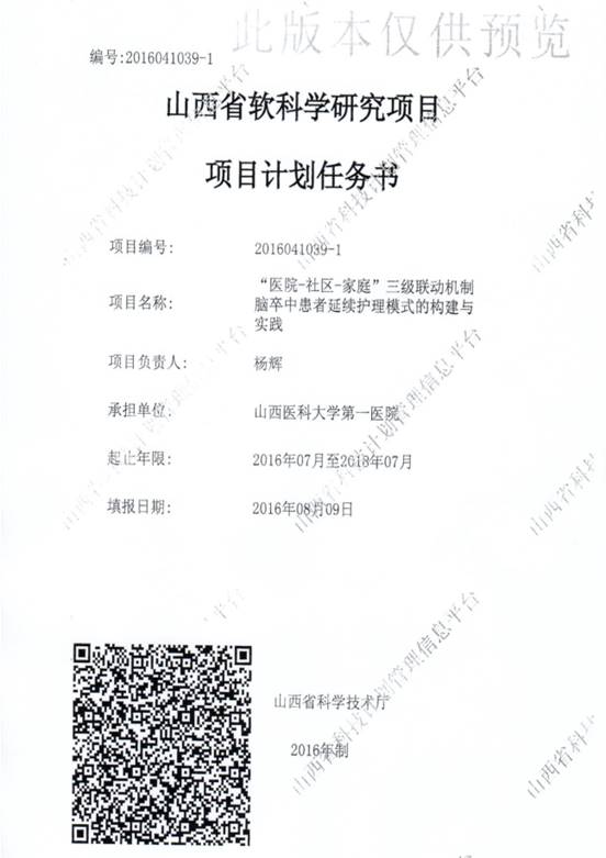 针对脑卒中患者疾病特点,学科临床护理团队基于山西省软科学项目《“医院-社区-家庭”(HCH)三级联动机制脑卒中患者延续护理模式的构建与实践》,构建了适合我国脑卒中患者的护理评价体系,制定了脑卒中患者延续护理模式实践指南与脑卒中延续护理技术规范,创建了延续护理网络支撑平台,最终规范化该延续护理模式,实现护理服务“医院-社区-家庭”无缝衔接。