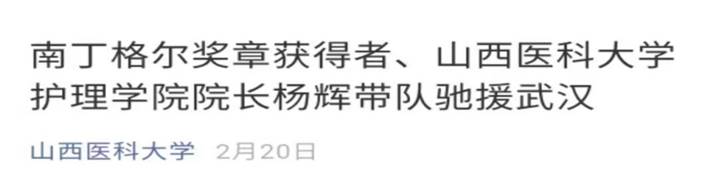 庚子年初,南丁格尔奖章获得者杨辉院长花甲之年率队出征,带领山西省第 12 批医疗队奔赴武汉中南医院,又转战雷神山。亲历过“非典”、汶川地震、王家岭矿难、太长高速重大交通事故等特大灾难,她勇气非凡、经验丰富,对抗疫一线的山西1048名护理人员起到了定盘星的作用。她迅速组织来自各附属医院的护理精英,落实三级质控,“6S”管理模式进病区,设立外勤护士,成立心理关爱组,开展“话疗”护理,建立“三足鼎立”闭环式排班,在没有特效治疗方案的情况下,以专业的职业素养改善管理,增强实效;以悲悯共情的朴素情怀走近患者,替代亲情。