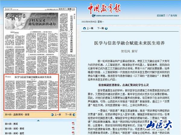 6月6日,《中国教育报》第9版“高教周刊·探索”版刊发万象城贺培凤教授、解军教授的联合署名文章《医学与信息学融合赋能未来医生培养》。