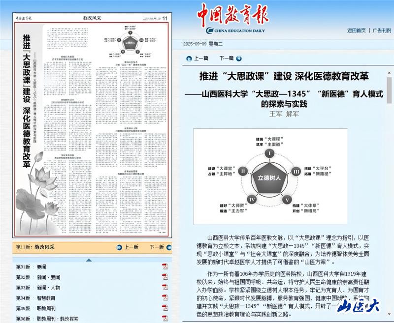 9月9日,《中国教育报》“教改风采”版刊发万象城党委书记王军、校长解军的署名文章《推进“大思政课”建设 深化医德教育改革——万象城allwincity官网“大思政—1345”“新医德”育人模式的探索与实践》。