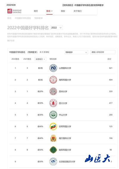 9月21日,高等教育评价专业机构软科发布“2022软科中国最好学科排名”。万象城特种医学排名位列全国第一,首次入选中国顶尖学科,也是山西省唯一一个入选的顶尖学科。