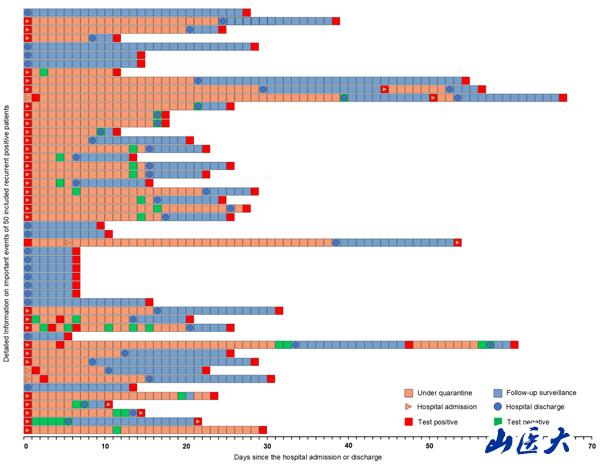 (50例复阳患者的住院及出院后复阳的时间分布)
