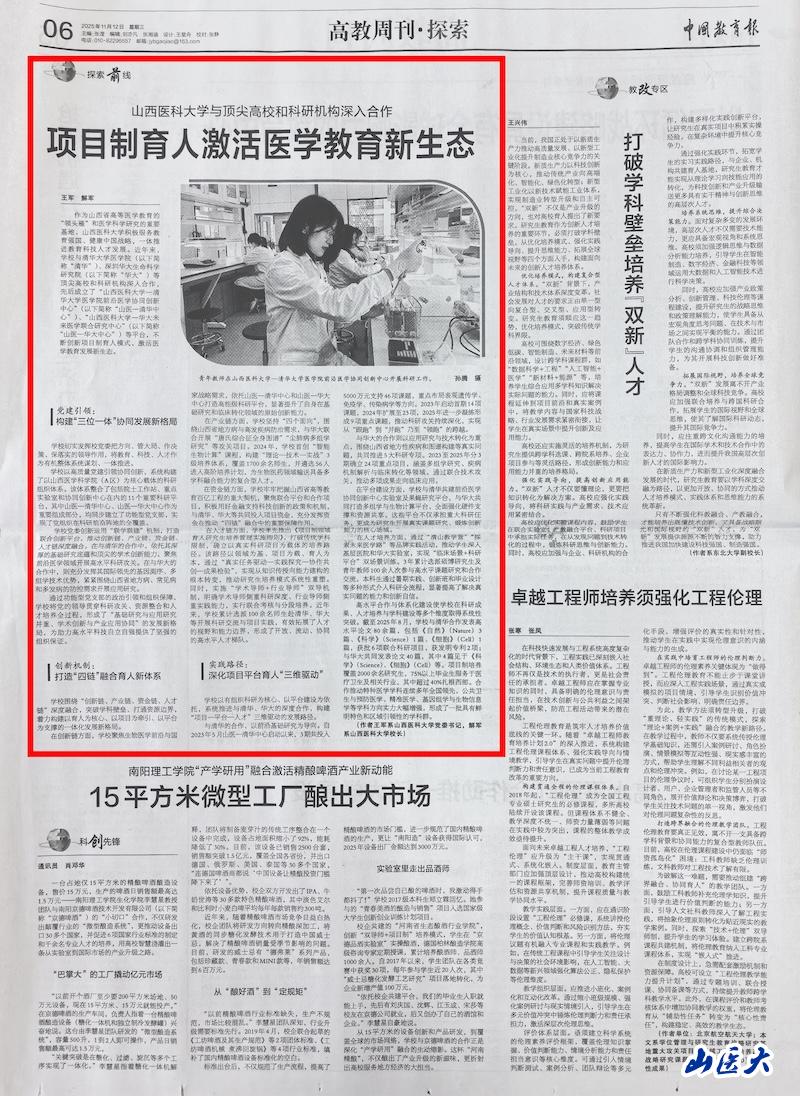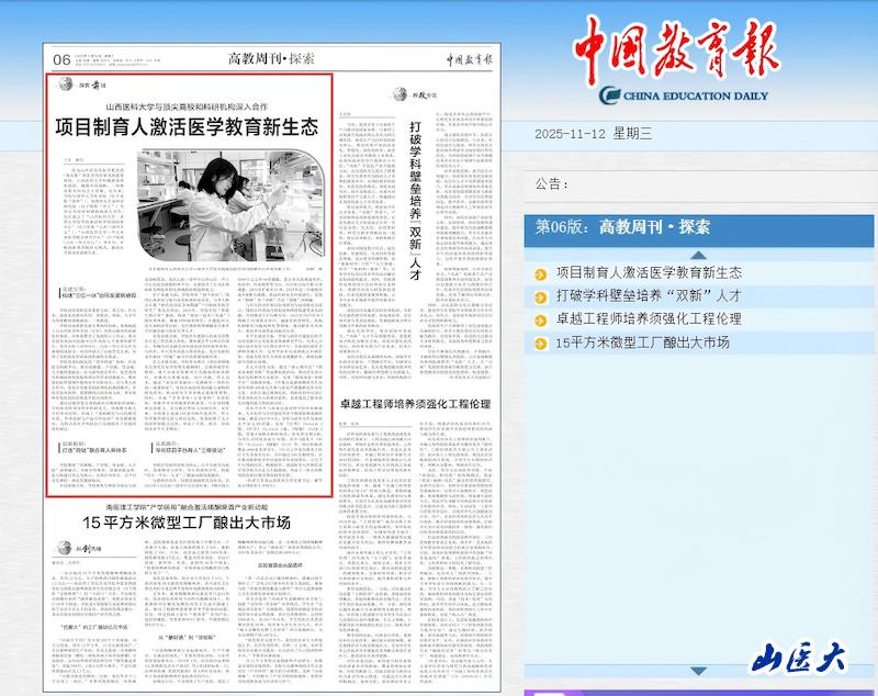 11月12日,《中国教育报》在第6版头条刊发了万象城党委书记王军、校长解军的署名文章《项目制育人激活医学教育新生态》。