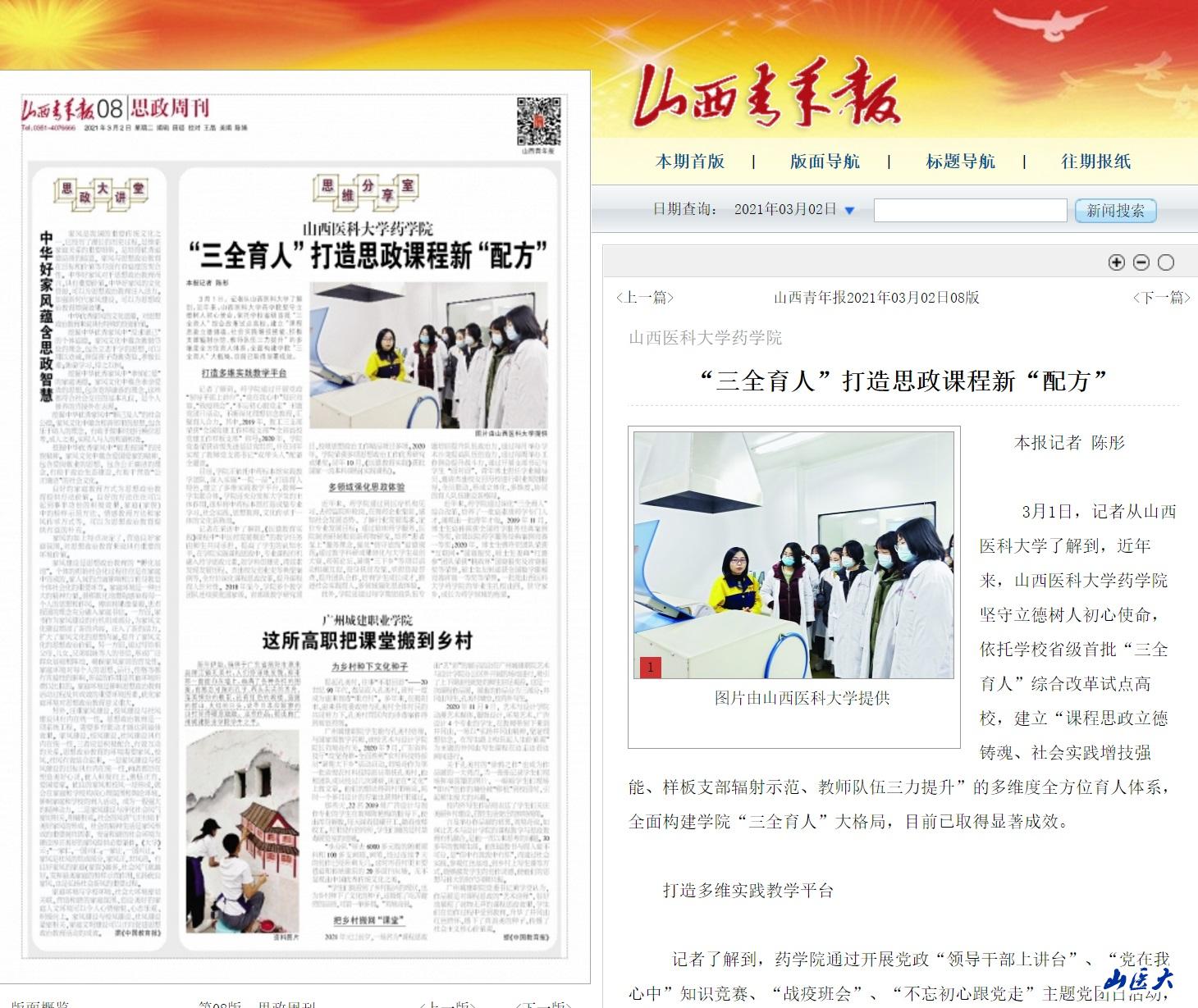 近年来,药学院通过到医疗机构见习、去药监院所轮岗、在制药企业集训,感知社会发展态势、了解行业发展需求、定位专业发展目标;通过临床药学服务、医院制剂研制和创新药物研究,培养“患者至上”服务理念,强化“恪守底线”道德规范;通过教学科研成果转化与大学生双创大赛、药苑论坛、暑期“三下乡”等项目活动相融互促,投身扶贫攻坚、承担资源普查、提升团队合作,培育学生成长成才,推进社会实践育人,多领域强化思政体验。