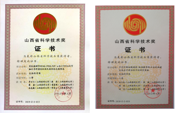 近五年,承担国家及省部级各类科研项目90余项,累计科研经费3200余万元;获得省部级以上奖励4项。发表SCI收录论文180余篇;获得国家发明专利授权30余项。围绕区域医药行业需求,开展产学研合作与研究,产出一系列标志性成果,有力推动了学科建设与产业创新良性互动。1、山西省“天然来源创新药物的研究与开发”科技创新重点团队研发中的一类新药候选物,与振东制药集团签订了合作开发协议,已完成全部临床前研究,有望成为糖尿病肾病的新型特异性治疗药物。2、鉴于目前中药评价指标成分与功效关联性不强的瓶颈问题,药物分析学科团队创新性构建了高通量活性筛选辨析体系,成功用于25种大宗药材及复方中质量标志物的确定,提供了与药效关联密切的中药质量评价方法;受邀撰写TOP 1期刊综述,获山西省科技进步二等奖一项。3、青蒿素研究团队首次阐明自身诱导肠和肝首过代谢是导致时间依赖性生物利用度降低主要原因;并基于该代谢特点及耐药相关因子,构建系列青蒿素类、紫杉醇类等靶向抗疟/抗肿瘤纳米递药系统,显著改善PK/PD特性,为攻克青蒿素耐药性难题提供新策略,入选国家青蒿素研究联盟理事单位。4、针对山西部分道地药材质量标准落后及道地性形成机制不明难题,潞党参研究团队明确了发挥生物调控活性的物质基础,建立道地药材遗传转化体系,创新性构建基于多糖的道地性特征体系;制订了17个道地药材标准;获2项国家重点研发计划等资助等成果。5、临床药理学团队突破临床上细菌耐药和肝损伤缺少特异性标志物的瓶颈,创建近 500 种差异蛋白分子信息数据库首次提出 gyrB 突变在铜绿假单胞菌对喹诺酮类药物耐药中的作用,创造性提出的抗生素用药方案在省内外 7 家三甲医院推广,获邀国际抗生素耐药性学术大会发言;筛选的有机锡致脂质合成及代谢紊乱相关的潜在诊疗靶点得到国际同行认可,获省自然科学二等奖。