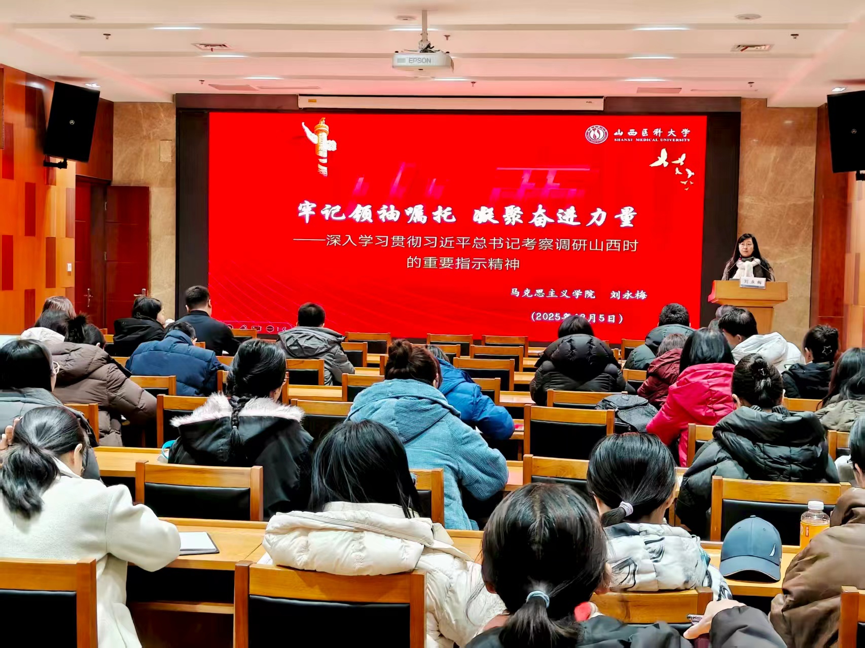 刘永梅以《牢记领袖嘱托 凝聚奋进力量——深入学习贯彻习近平总书记考察调研山西时的重要指示精神》为题展开专题讲解。她围绕习近平总书记提出的“努力在推动资源型经济转型发展上迈出新步伐,奋力谱写三晋大地推进中国式现代化新篇章”等核心要求,结合习近平总书记在太原、运城的考察具体场景,重点解读了“将资源优势转化为发展优势”对高校人才培养的启示,明确提出辅导员要引导医学生立足山西发展需求,在专业领域深耕实干;此外,她还结合“赓续红色血脉”的要求,强调要在日常工作中融入伟大抗战精神等红色教育内容,厚植学生家国情怀。