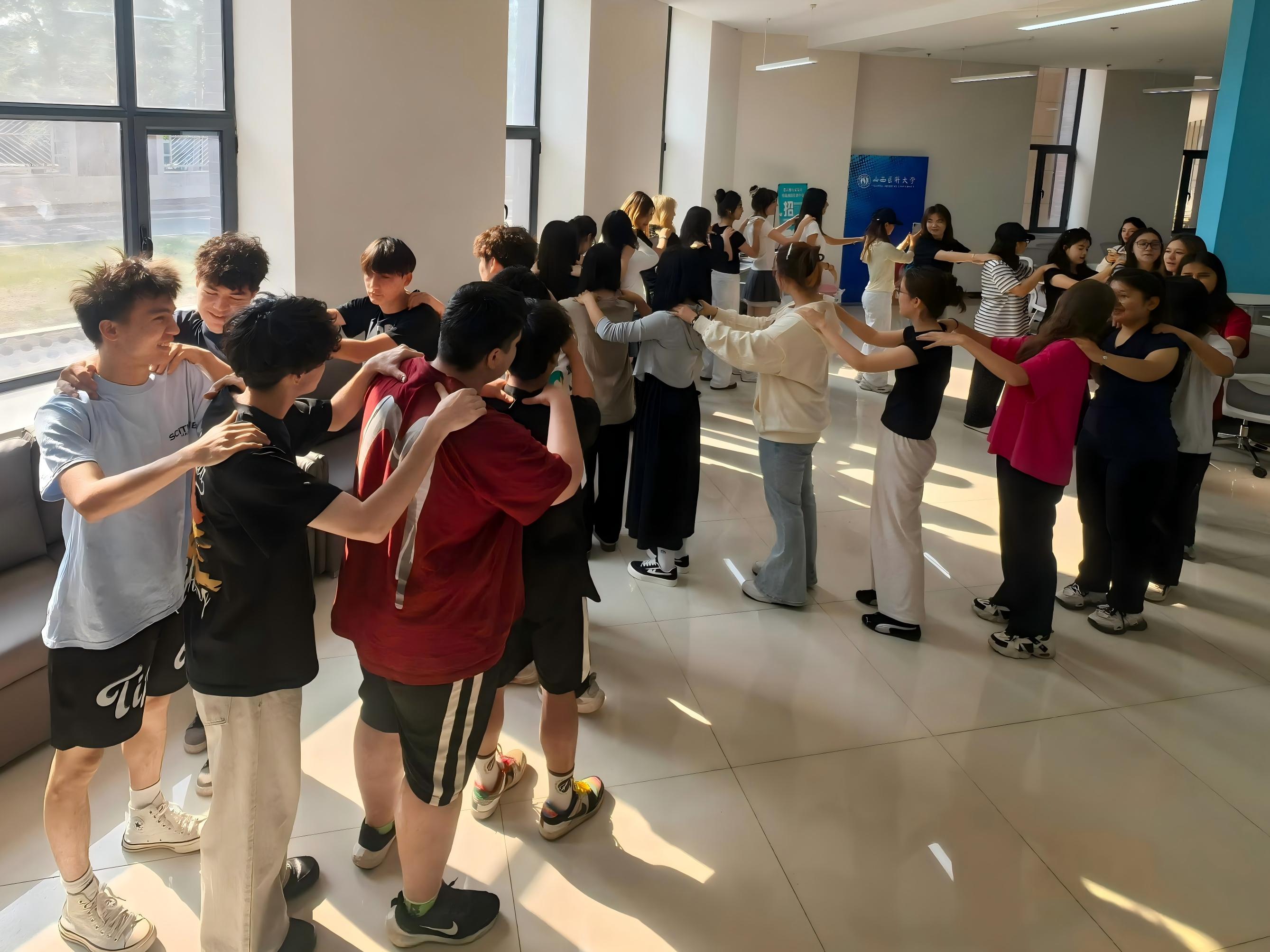 本次活动巧妙把“身体放松、社交互动与艺术表达”融为一体。主持人以“接力按摩”开启破冰环节,引导同学们围成圆圈为同伴捏肩捶背,一句“是闺蜜不是敌蜜”的幽默提示,让笑声驱散紧张,转身回馈的互动设计,更让互助的温暖在肢体接触中自然流动,为后续环节奠定轻松信任的基调。“名字接龙”阶段,各组的复述与提示声此起彼伏,洋溢着青春的活力与协作的热情;进入肌理画创作后,现场渐趋安静,唯有工具与画布接触的沙沙声,同学们时而皱眉调配色彩,时而舒展眉头堆叠纹理,专注的神情与手下渐次成型的肌理相映,构成一幅“压力在笔触中消融,情绪在创作中沉淀”的生动画面。混合着沙粒的颜料在画布上堆叠出各异肌理,宛如年轻心灵的生命轨迹在此凝固。
