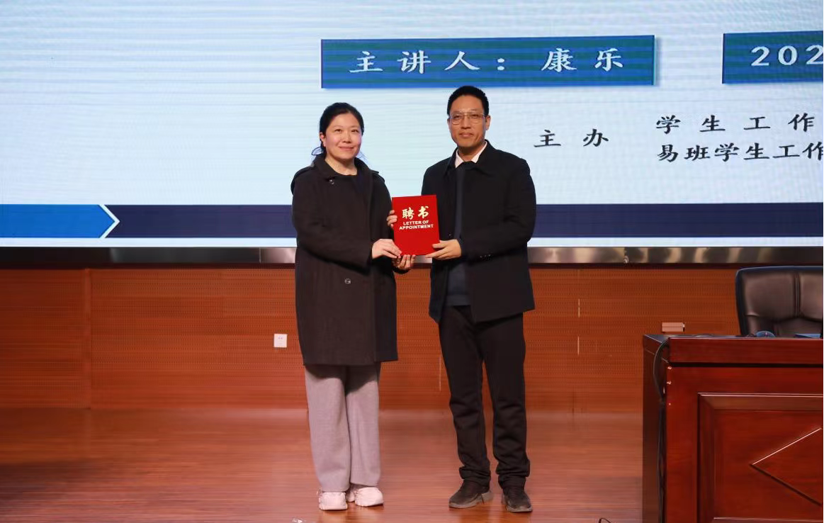 讲座开始前,学生工作部聘请康乐为易班学生工作站指导教师,副部长杨洁为其颁发聘书。