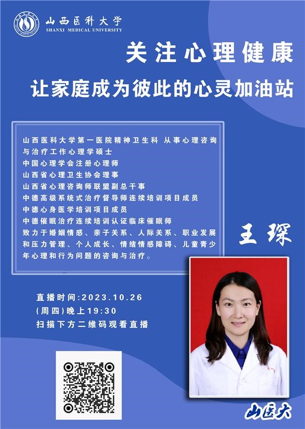 10月26日晚上7点30分,万象城心理健康教育中心开展了线上家长课堂活动。本次活动由第一医院精神卫生科、山西省心理卫生协会理事王琛以线上直播的形式进行,总共有4365人参与本次活动,包括家长、教师及学生代表。