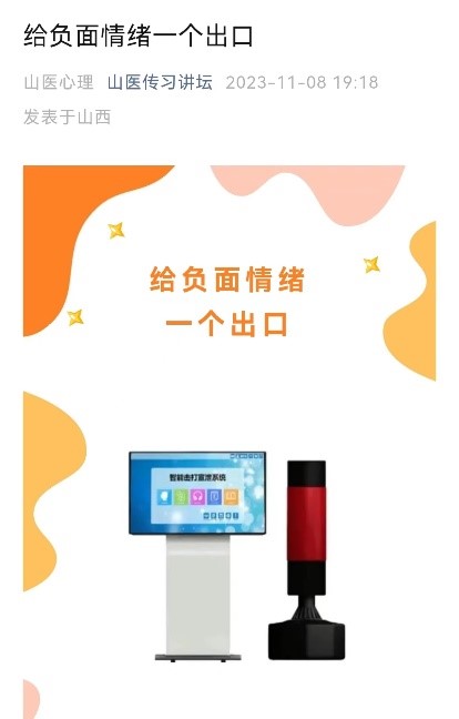 11月8日心理健康教育中心在万象城公众号发布情绪宣泄仪和音乐治疗椅预约方式,并向同学们详细讲解了两个心理仪器的功能。生气是每个人都会遇到的事情,人在生气的时候,往往会失去理智,做一些出格的事情,而合理地发泄情绪能够让人减少不必要的损失,一个心理成熟的人就是善于及时地宣泄和调节自己的情绪,而情绪宣泄仪和音乐治疗椅的上线旨在为同学们提供宣泄和调节情绪的方式。