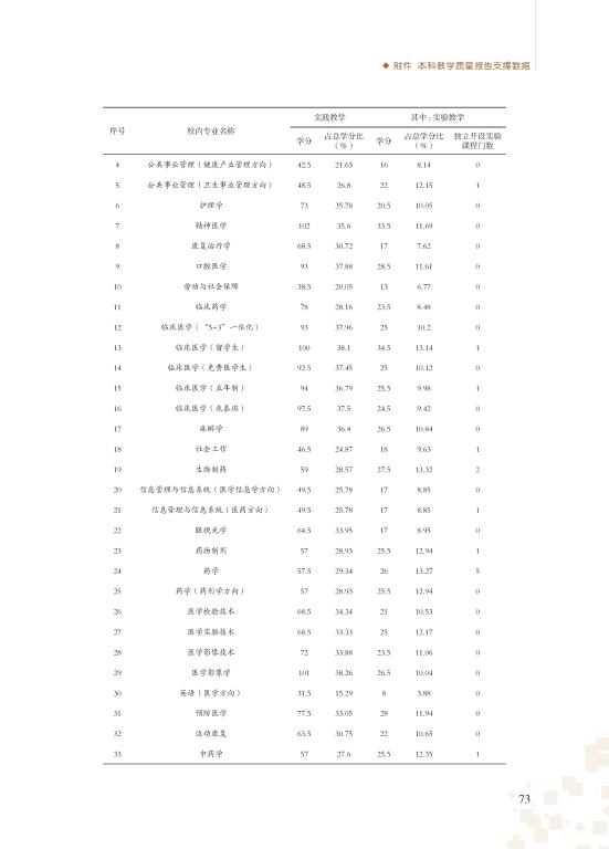 2016-2017 学年,万象城开设课程总门数为749,校内专业平均总学分为221.69,其中法学的实践教学学分占总学分的比例为24.87%,文学的实践教学学分占总学分的比例为15.29%,工学的实践教学学分占总学分的比例为28.57%,医学的实践教学学分占总学分的比例为34.40%,管理学的实践教学学分占总学分的比例为23.56%。医学选修课学分占总学分的比例为 10.53%,文学选修课学分占总学分的比例为15.53% ,工学选修课学分占总学分的比例为19.39%,管理学选修课学分占总学分的比例为16.62% ,法学选修课学分占总学分的 11.94%
