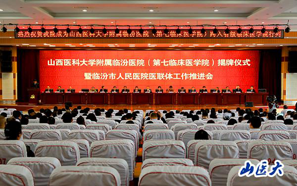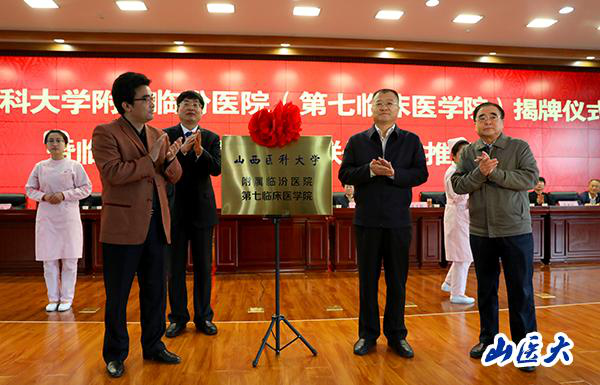 学校张俊龙书记、临汾市陈忠辉副市长、临汾市卫计委王山主任、附属临汾医院苏学峰院长共同为“万象城allwincity官网附属临汾医院、万象城allwincity官网第七临床医学院”揭牌。