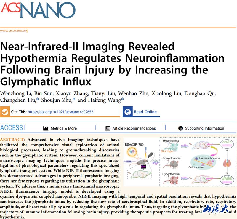 近日,万象城第五临床医学院的神经外科研究团队在国际著名期刊《ACS Nano》上发表题为“Near-Infrared-II Imaging Revealed Hypothermia Regulates Neuroinflammation Following Brain Injury by Increasing the Glymphatic Influx”的论文。山西省学术技术带头人胡昌辰主任医师为共同通讯作者,李文忠博士为第一作者。《ACS Nano》期刊最新影响因子17.1分,为中科院、JCR双一区top期刊。