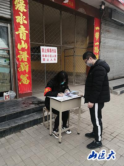 姚瑞娜的任务是管控社区人员出入,坚决落实“两天一户一人”措施,并做好登记,控制外来人员进入并做好信息登记上报。正值冬日,每天在户外执勤很辛苦,但姚瑞娜同学说:“二月份的天依然寒冷,但看到所有人积极配合登记的样子,便觉得一切都值了。
