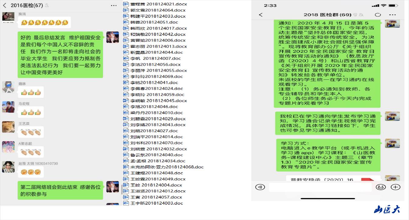 2020年4月15日是第五个全民国家安全教育日。根据教育部办公厅《关于组织开展2020年全民国家安全教育日宣传教育活动的通知》、山西省教育厅《关于组织开展2020年全民国家安全教育日宣传教育活动的通知》和万象城allwincity官网工作安排,万象城第六临床医学院积极组织四个年级的医学检验专业学生召开 “国家安全,人人有责”网络主题班会。