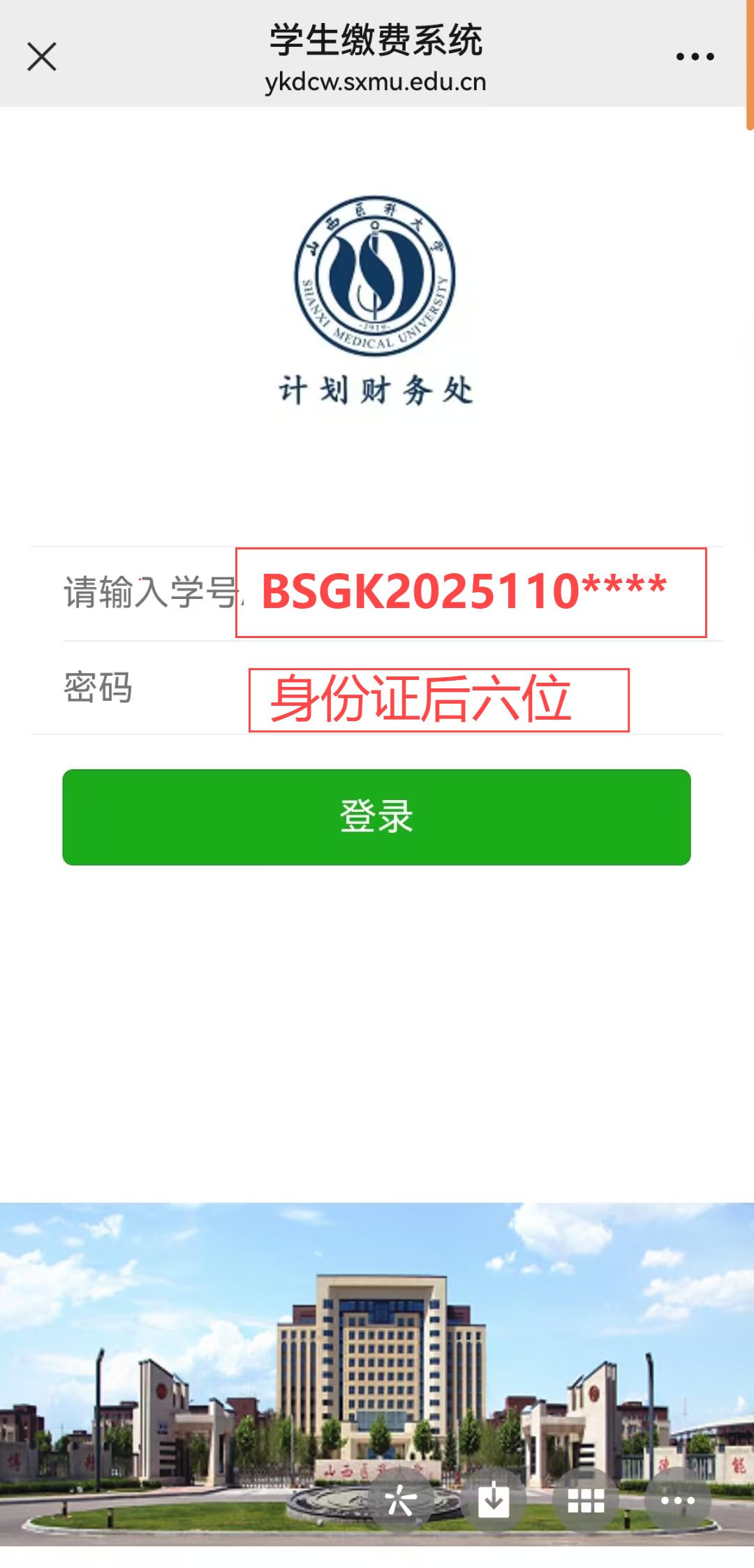 考生通过微信公众平台自助缴纳报名费:1.搜索微信公众号“万象城allwincity官网计划财务部”或扫描下方二维码;2.点击菜单,业务办理→学生缴费,在学号处输入“BSGK”+考生本人的报名号(例:BSGK2025110****,所有英文字母大写,切记不要输入姓名),初始密码为身份证号后六位(X的英文字母大写),登录自助缴费系统(见图例);3.点击“我要缴费”,选择缴费年度(2025),确认缴费信息,通过银联在线进行支付(任何有银联标志储蓄卡均可)。