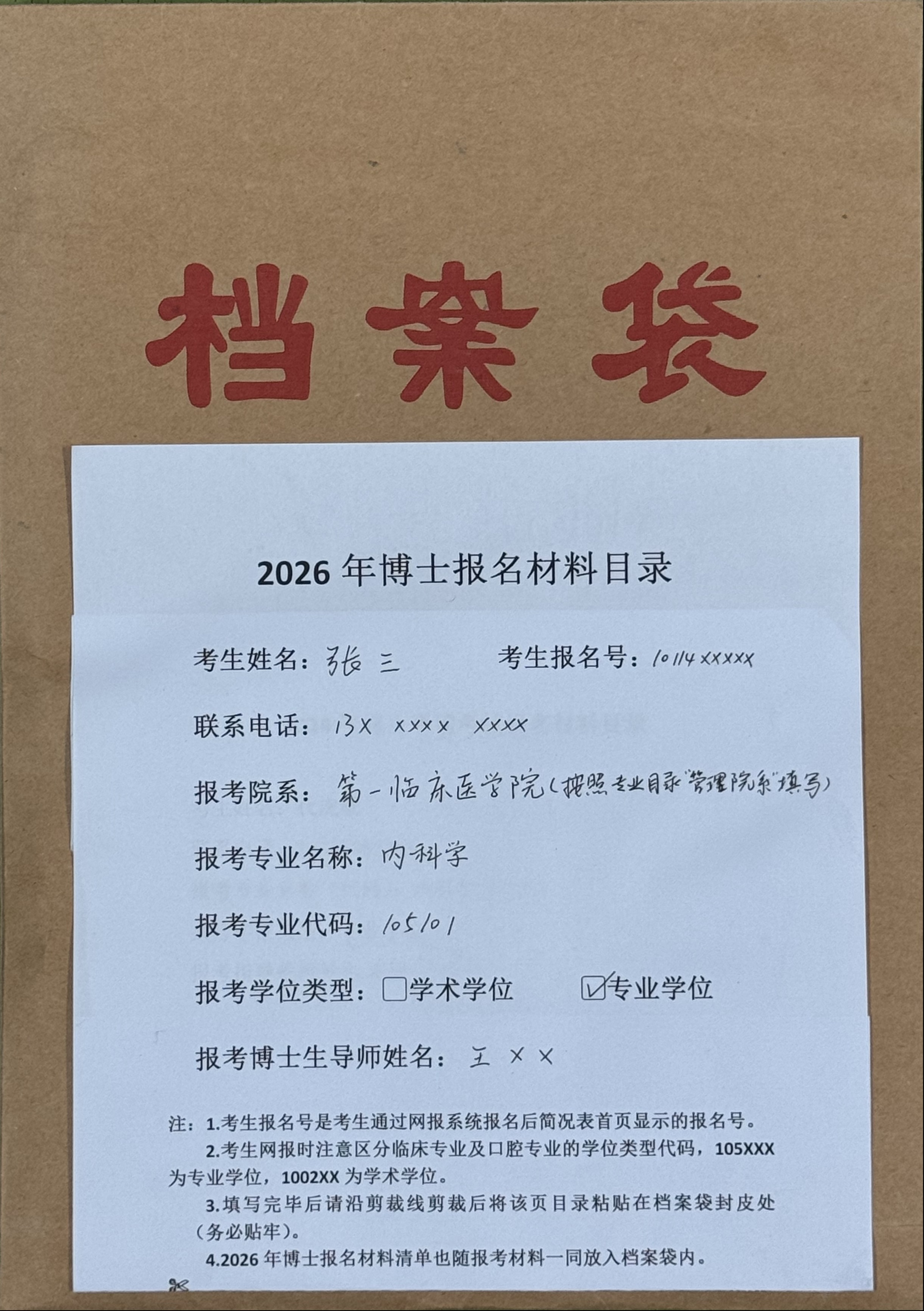 考生完成网上报名并确定报名志愿后,按照清单列表将个人报考材料统一装入自备的档案袋内(见图例1、2)。