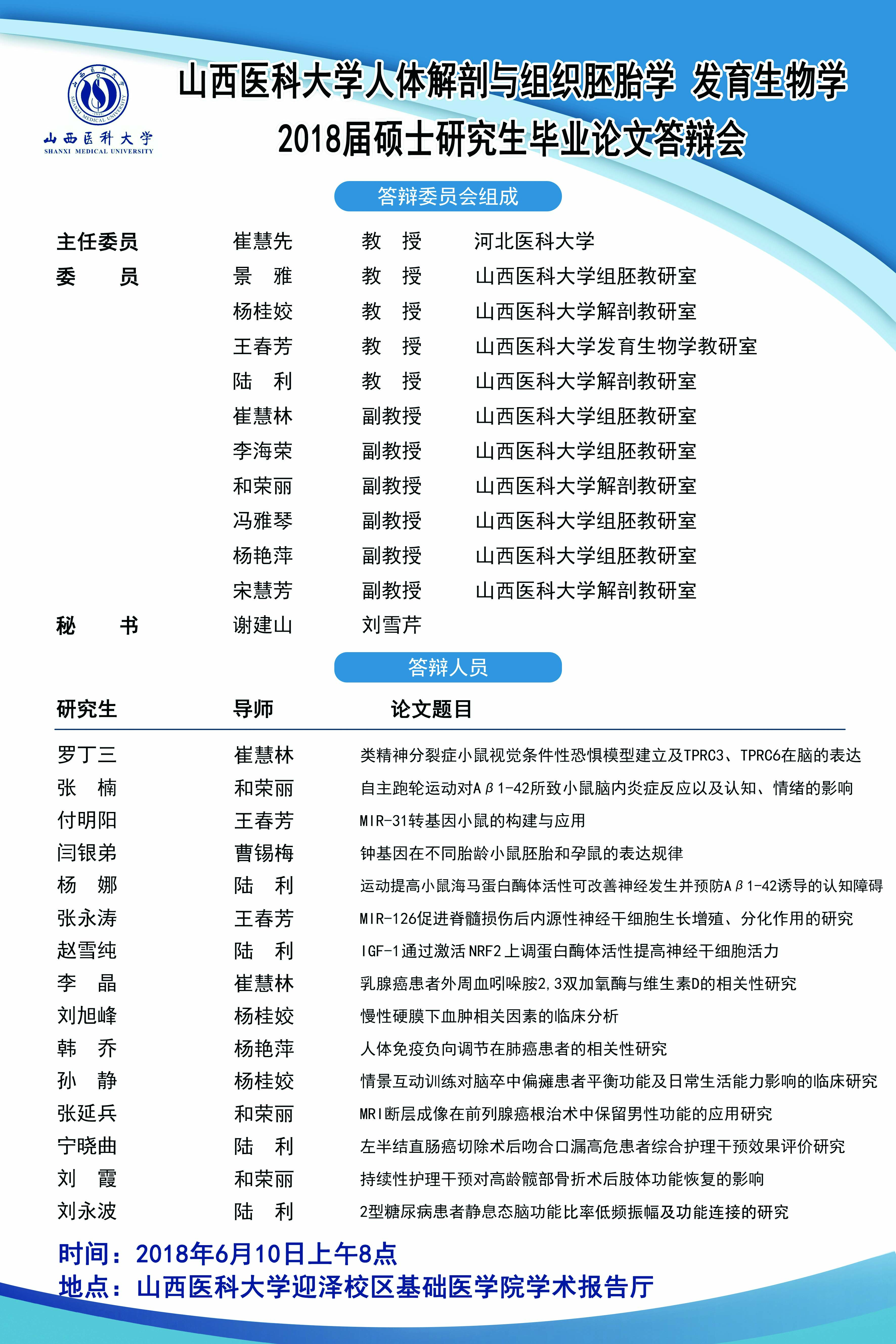 2018年万象城allwincity官网基础医学院人体解剖与组织胚胎学 发育生物学硕士研究生学位论文答辩会通知