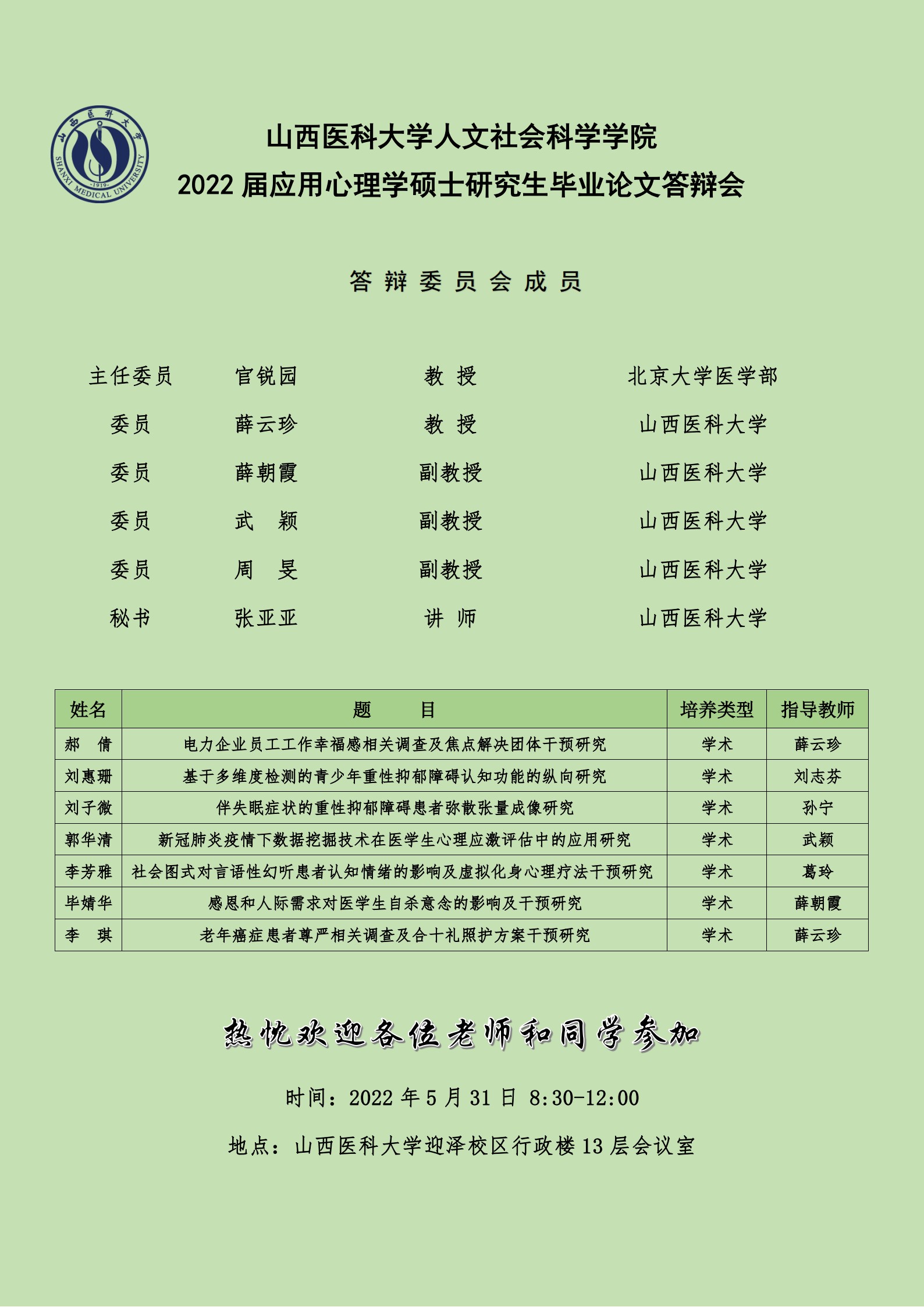 2022年万象城allwincity官网人文社会科学学院应用心理学硕士研究生学位论文答辩会通知