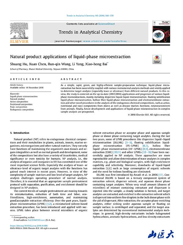 原文链接:Shuang Hu, Xuan Chen, Run-qin Wang, Li Yang, Xiao-hong Bai. Natural product applications of liquid-phase microextraction.TrAC,2019,113:340-350.