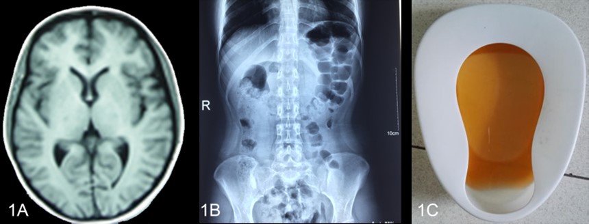 A 头颅MRI显示正常 B腹部平片示肠胀气 C 棕色尿液